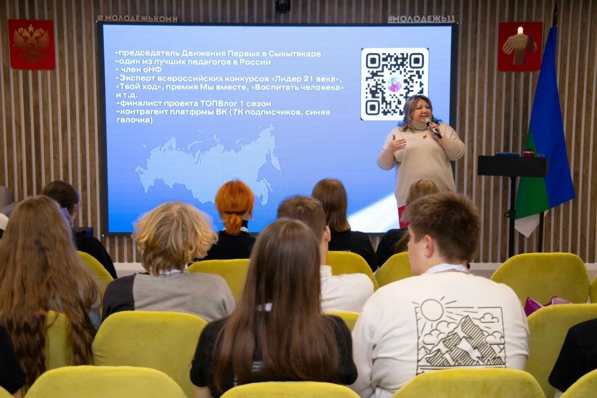 На лекции «Лидеры России: смысл не в том, чтобы стать кем-то, а в том — чтобы стать собой по-настоящему» выступила Елена Шилова, председатель совета Движения Первых в Сыктывкаре, призёр конкурса «Сердце отдаю детям» и финалист «ТопБлог». Она рассказала о том, что лидерство — это, прежде всего, путь к подлинности.